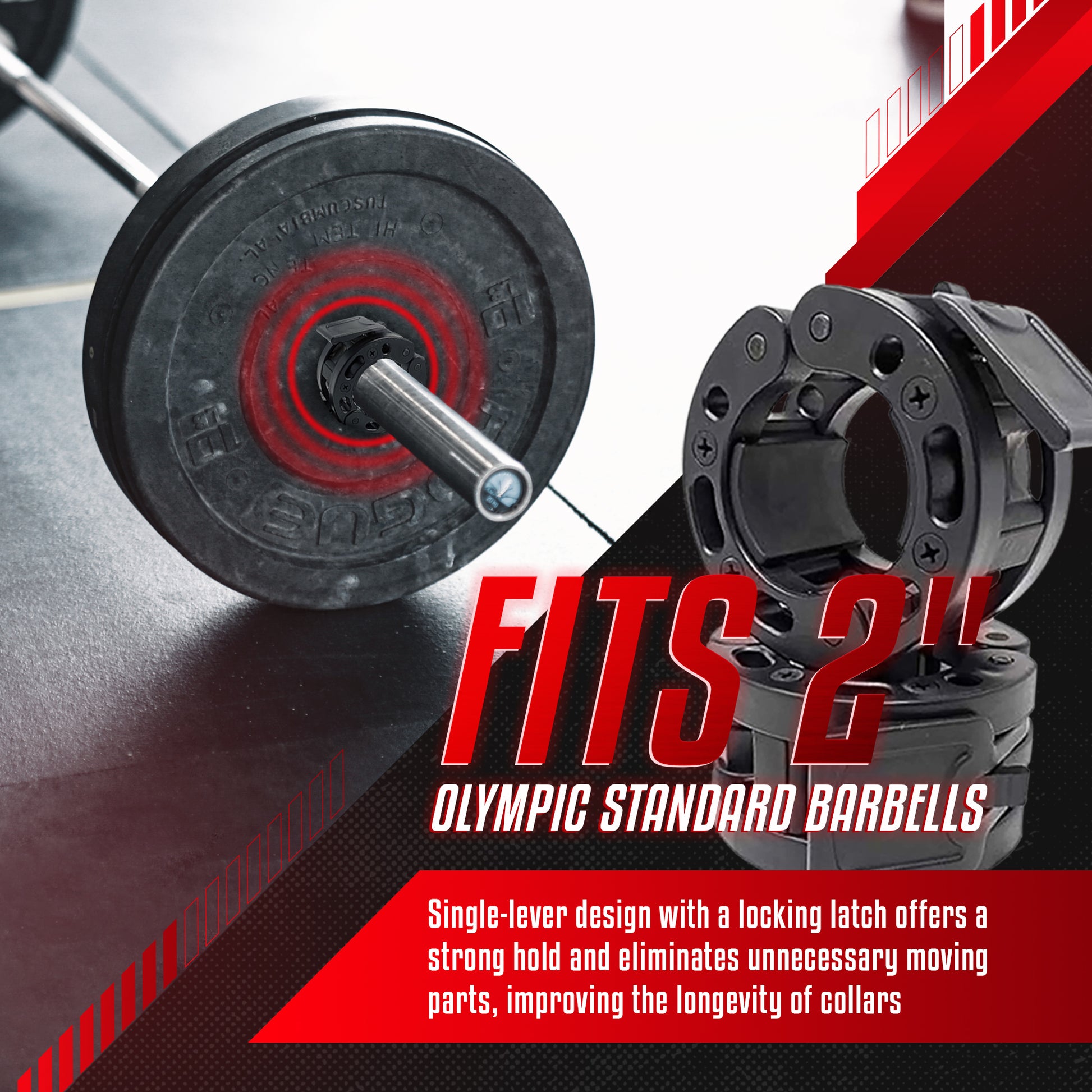 ​Our barbell clamps are sold in pairs and have a standard 2-inch diameter. These clamps will fit any olympic 2-inch barbell or Hex bar.